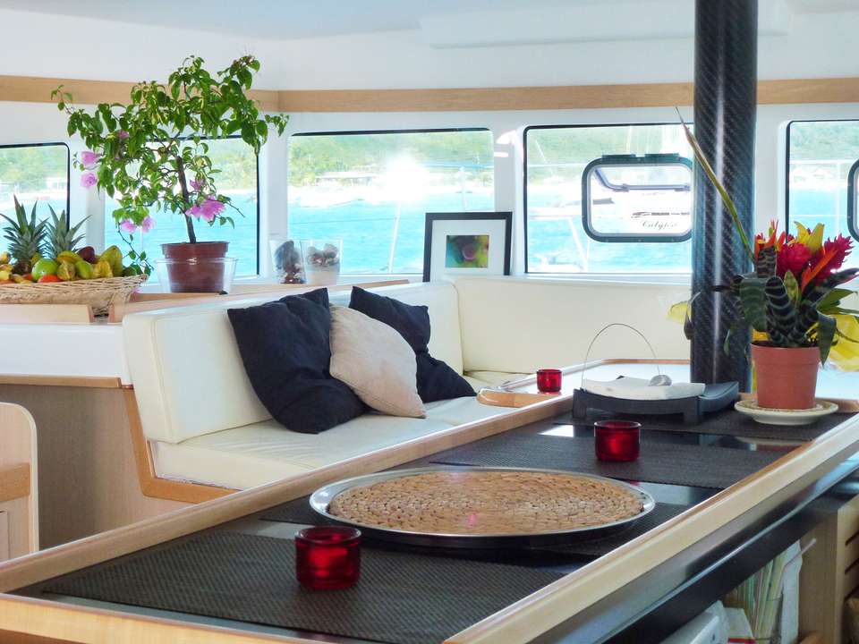 Step aboard your Catlante 600, a 17 metre long and 8 metre wide catamaran. Its interior and exterior layout offer spacious and friendly spaces so that each guest feels at home. The aft deck will allow you to enjoy meals with ease while enjoying the scenery. The flybridge is often guest's favourite place as it has a 360-degree panoramic view and a comfortable bench to relax. The boats wide rear skirts ensure comfort and safety when swimming.