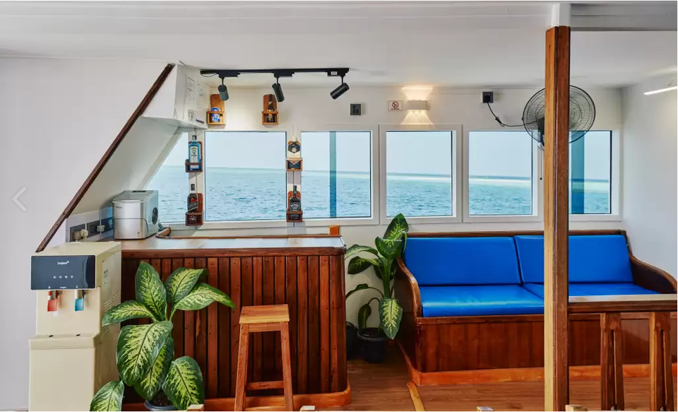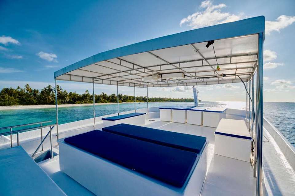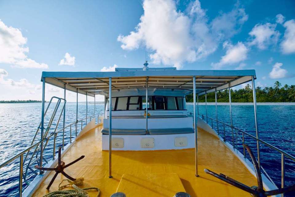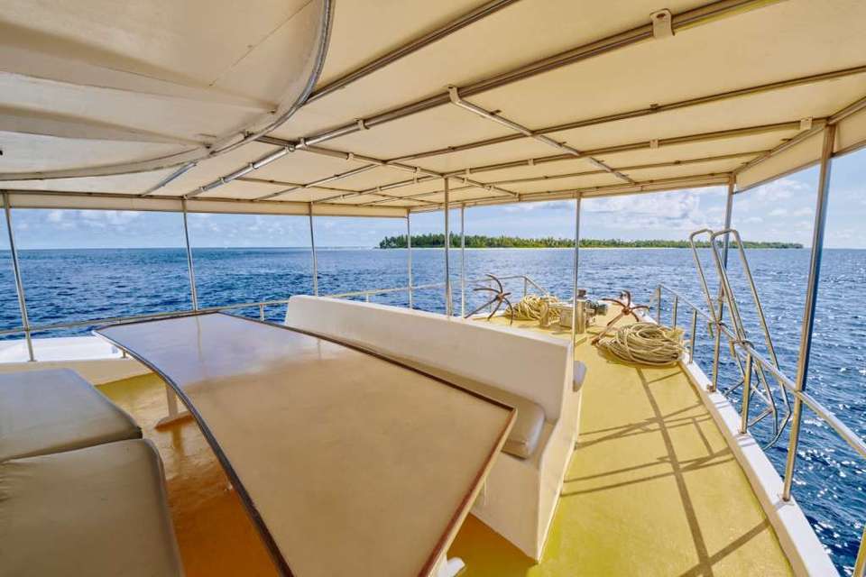 Your adventure will take place aboard the Horizon II yacht. This traditional wooden boat is 25 meters long and has three decks. You will enjoy delicious local dishes prepared by the crew on the main deck. You can choose between the indoor dining room at the rear of the boat or an outdoor table at the front, where you can enjoy your meal overlooking the ocean. At the end of the day, you can relax on the sun deck on the deck chairs and admire the view of the atolls.