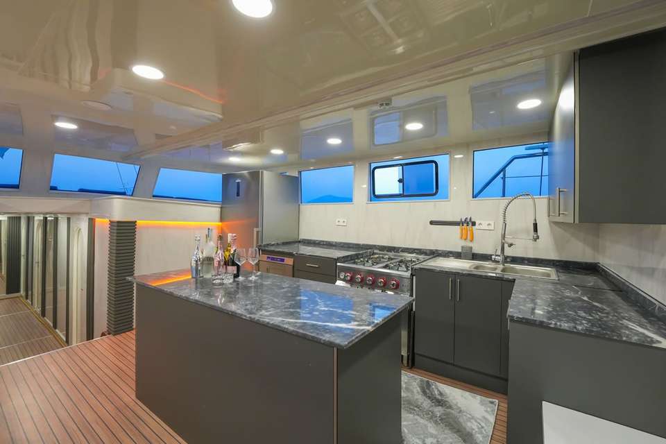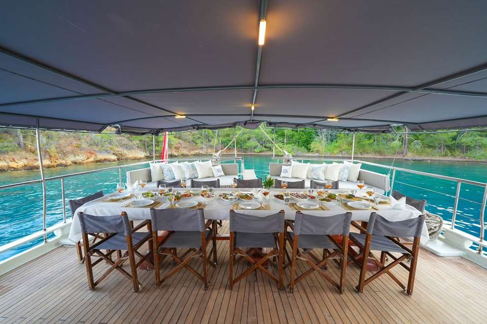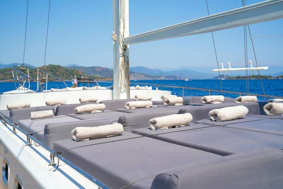 Come aboard Tarsu, a gulet (28 meters long and 6.50 meters wide) with a modern décor. You'll have access to the upper deck to admire the view of the coast and enjoy comfortable mattresses to relax in the sun. Meals are served at a spacious table at the rear of the boat, where you can sample delicious local dishes prepared by your chef. Inside, the lounge area will allow you to share convivial moments with your fellow passengers.
