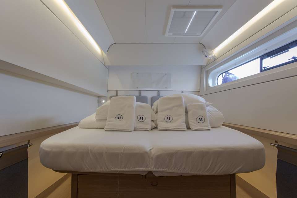A spacious model designed for larger groups. It consists of 6 double cabins, 4 bathrooms, a large interior saloon, an XL cockpit, space to relax in the front, and excellent stability at sea.